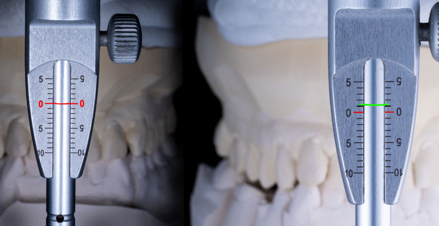 Links: Die passive Modellsituation im Gips. Rechts: Die dynamische Mundsituation beim Schlussbiss. Der Unterschied beträgt hier 1,2mm.